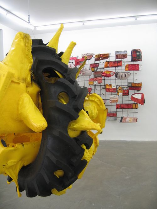 A cette ambiance de sinistrose, l’artiste souhaite apporter ses constructions nées des rebuts d’une industrie qui ferme ses portes, de pneus qui ont délaissé les routes…